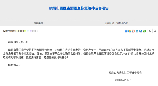 峨眉山景區官網截圖 人民網成都7月13日電 (任重)據峨眉山風景名勝區管理委員會官網消息,峨眉山景區由于受前期強降雨天氣影響,為確保廣大游客朋友的生命財產安全,于2018年7月10日采取了臨時管制措施,迅速對安全隱患開展了集中排查整治。目前,景區主要景點安全隱患已經排除,峨眉山風景名勝區管理委員…[詳細]