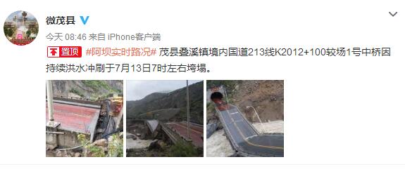 四川茂縣縣委宣傳部官方微博截圖 人民網成都7月13日電 (王波)記者剛剛獲悉,近日,四川省阿壩州茂縣境內連續強降雨,今日上午7時左右,該縣疊溪鎮境內國道213線K2012+100較場1號中橋因持續洪水沖刷垮塌,造成交通中斷。目前,交警已經在橋兩側路段實施交通管制措施,暫無法預計通行時間。 …[詳細]