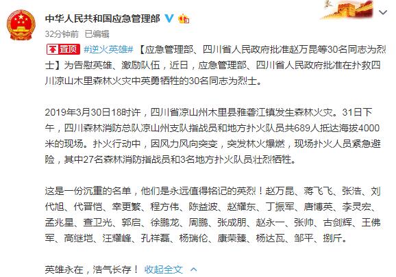 人民網成都4月4日電 (任重)據應急管理部官方微博消息,為告慰英雄、激勵隊伍,近日,應急管理部、四川省人民政府批準在撲救四川涼山木里森林火災中英勇犧牲的30名同志為烈士。 2019年3月30日18時許,四川省涼山州木里縣雅礱江鎮…[詳細]