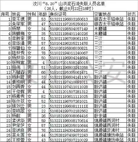 人民網成都8月23日電 (朱虹)記者從阿壩州政府新聞辦獲悉,汶川“8.20”強降雨特大山洪泥石流遇難人員和失聯人員最新名單公布。截至目前,災害共造成12人遇難(身份信息已全部核實完畢)、26人失聯![詳細]