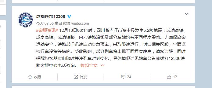 人民網成都12月18日電 (郭洪興)中國地震臺網正式測定:12月18日08時14分,在四川內江市資中縣(北緯29.59度,東經104.82度)發生5.2級地震,震源深度14公里。據中國鐵路成都局集團有限公司官方微博消息,成渝高鐵、成貴高鐵、成渝鐵路、內六鐵路沿線及部分車站均有不同程度震感,部分列車將…[詳細]
