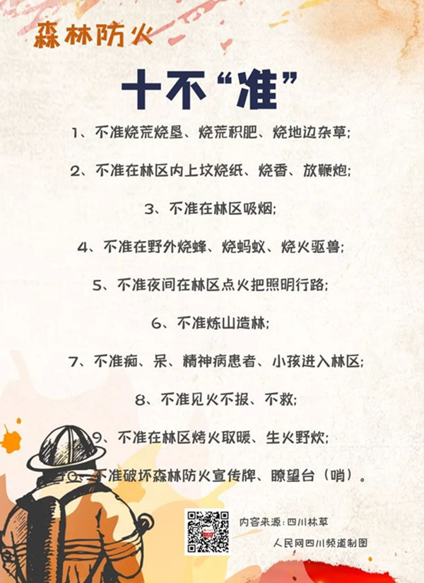 人民網成都4月3日電 4月1日,應急管理部發布消息,預計4月2日至6日,四川南部局部地區森林火險等級將達到極度危險級別,防火形勢異常嚴峻,國家森林草原防滅火指揮部辦公室特向四川省發布高森林火險紅色預警。當下,氣溫迅速回暖,野外風干物燥,是森林火災的高發期,特此提醒廣大市民:進入林區必須嚴格遵守森林防…[詳細]