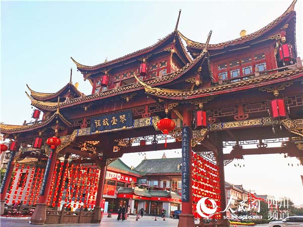 裝飾一新的琴臺路大門。人民網 劉海天攝 “掛彩燈,掛彩燈,一路掛個吉祥燈,瑞光籠罩你家門……”還有幾天就要過春節了,成都大街小巷掛滿了紅燈籠,散發出濃濃的年味兒。本就金碧輝煌的琴臺路,現在裝飾得更加喜慶,紅燈滿街,花香四溢。 琴臺路,是個有詩有酒有典故的地方。傳說司馬相如…