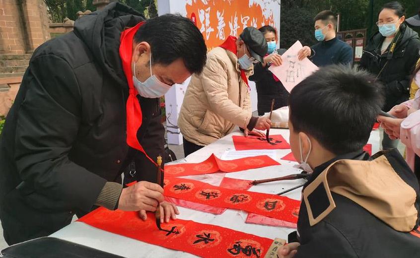 1月24日下午,在成都市人民公園內,一群老將軍帶著一群小學生,給市民寫春聯送春福,為錦繡蓉城增加一片詩情畫意。