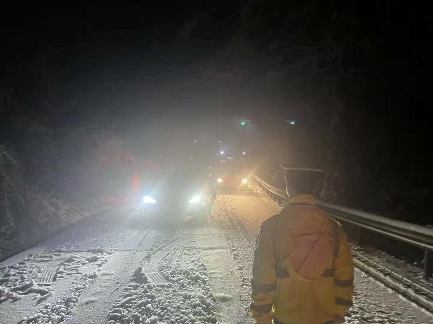 1月28日凌晨以來,四川省樂山市峨眉市、峨邊縣、馬邊縣等部分地區出現強降雪,其余大部分地區出現冰雪雨霧天氣。為全力護航道路交通安全,樂山公安交警全警動員,出動近2000警力通宵達旦、連續奮戰,全面加強冰雪雨霧天氣中道路交通指揮疏導。
