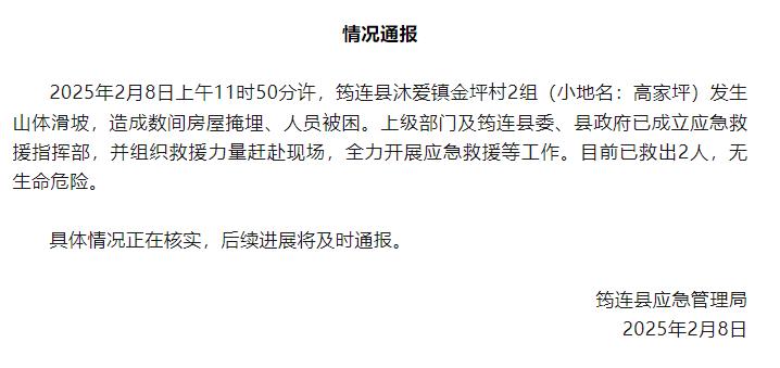 2月8日上午11時50分許,四川省宜賓市筠連縣沐愛鎮金坪村2組(小地名:高家坪)發生山體滑坡,造成數間房屋掩埋、人員被困。
