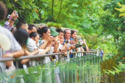 9月12日,中外嘉賓參觀大熊貓。 四川日報全媒體記者 趙明 攝 9月12日,在成都大熊貓繁育研究基地都江堰野放繁育研究中心(熊貓谷),第二屆金熊貓獎配套活動“我與熊貓面對面”參觀活動舉行,向世界講述大熊貓故事,傳遞生態文明和傳統文化的魅力。