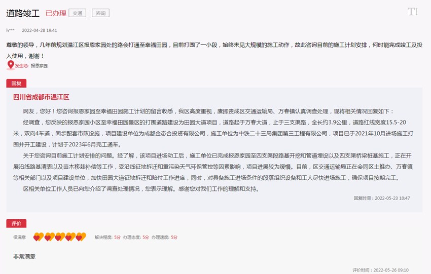人民網成都6月7日電 (王凡)“幾年前規劃的道路,始終未見大規模的施工動作,故此咨詢目前的施工計劃安排?!苯?,成都市溫江區一市民在人民網“領導留言板”上咨詢溫江區報恩家園小區至幸福田園景區道路何時能完成竣工及投入使用。 人民網“…
