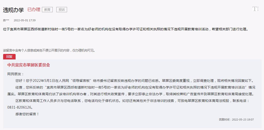 人民網成都6月16日電 (彭茜)近日,有網友在人民網“領導留言板”留言,稱位于四川省宜賓市翠屏區西郊街道新村臨時一街5號的一家名為“好老師”的機構,在沒有取得辦學許可證和相關執照的情況下違規開展教育培訓活動,希望相關部門進行處理。 …