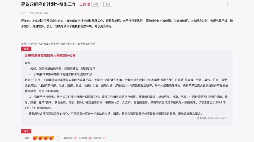 人民網成都3月1日電 (朱虹)近日,四川省涼山州會理市一名群眾在人民網“領導留言板”留言稱,近年來,涼山州為了預防森林火災,每年都在執行計劃性燒除工作,但是各地區并未嚴格科學執行,導致部分樹木被燒死,生態被破壞。 “以會理為例,會理氣候…