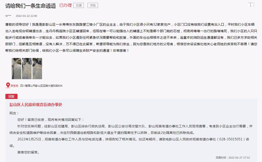 人民網成都3月28日電 (彭茜、趙祖樂)“請您幫我們給相關部門協調,給我們小區一條可以保障生命財產安全的通道!”近日,一位居住在四川眉山市彭山區的市民在人民網“領導留言板”留言稱,自己所居住的小區很小,小區車輛唯一可以出入的輔道上不知是哪個…