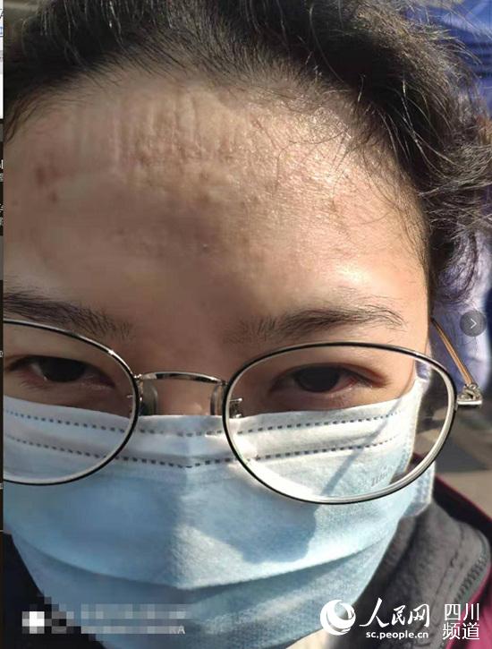 額頭上有口罩印記的曹孟。宜賓市第一人民醫院供圖