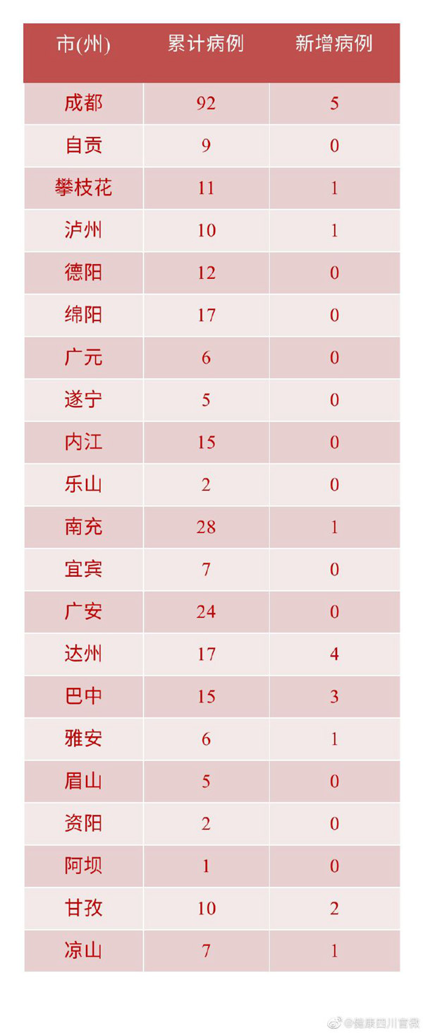 新增確診病例中,成都市5例、達州市4例、巴中市3例、甘孜州2例、攀枝花市1例、瀘州市1例、南充市1例、雅安市1例、涼山州1例。