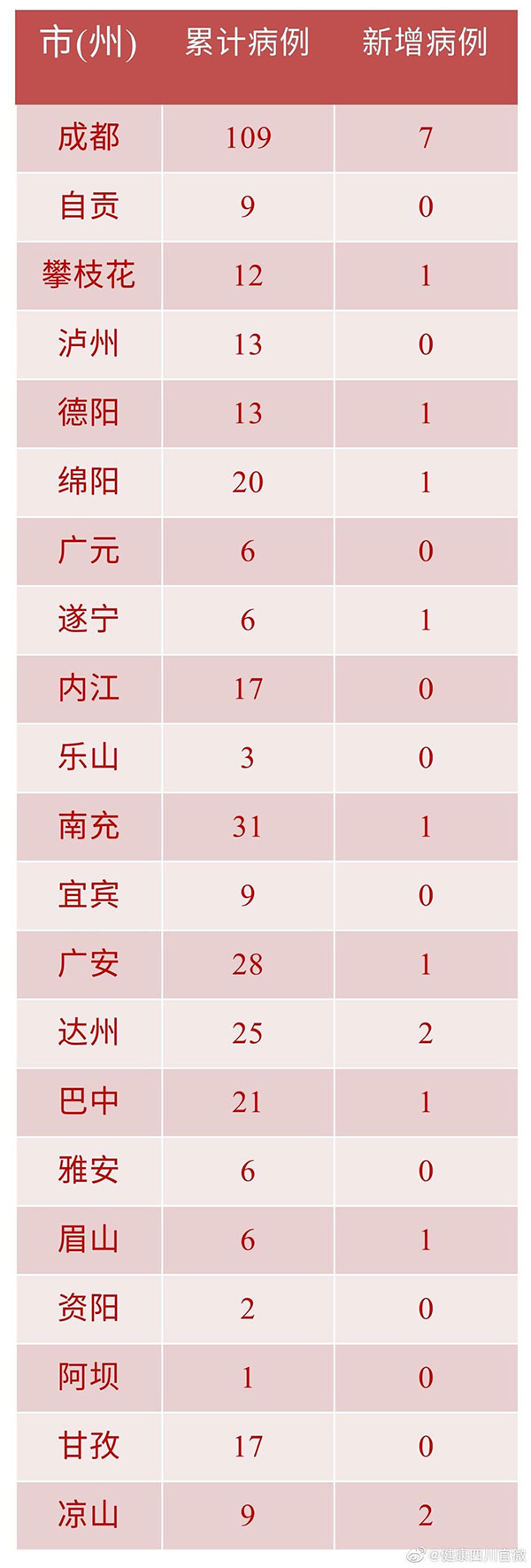 新增治愈出院病例中,成都市5例、自貢市2例、廣安市2例、攀枝花市1例、內江市1例、雅安市1例、巴中市1例。