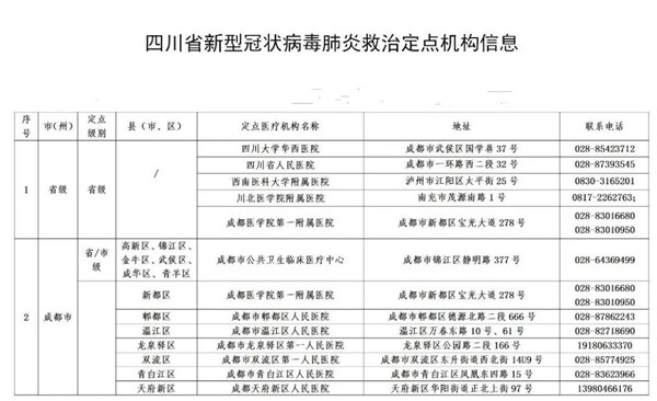 人民網成都2月16日電 (任重)據健康四川官微消息,為進一做好全省新型冠狀病毒感染肺炎患者醫療救治工作,按照集中患者、集中專家、集中資源、集中救治的原則,四川省確定了208家省市縣級定點醫院,現將四川省新型冠狀病毒肺炎救治定點機構信息公布如下: