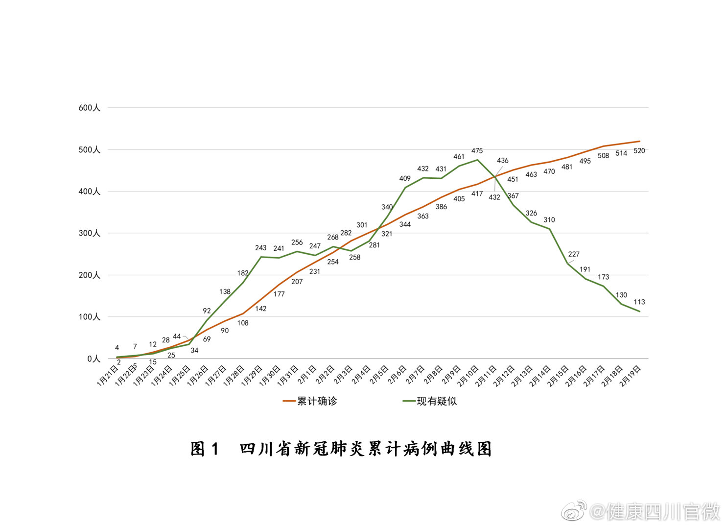 截至2月20日0時,四川省累計報告新型冠狀病毒肺炎確診病例520例,涉及21個市(州),F有疫情縣(市、區)98個(增加瀘縣1個,減少都江堰市1個)。