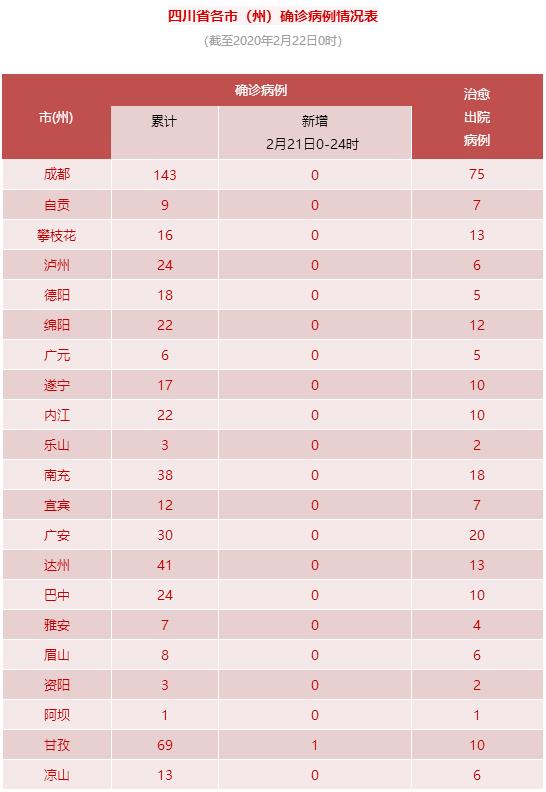 人民網成都2月22日電(王波)記者從四川省衛健委獲悉,2月21日0-24時,四川省新型冠狀病毒肺炎新增確診病例1例,新增治愈出院病例20例,新增疑似病例21例,無新增死亡病例。