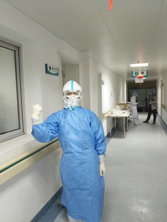 隊員李曉娟所在組有5個人,大家每次進病房前李曉娟都會在防護服上畫一顆心,雖然畫的不是很好,但這是她的心意,希望她們健康平安。