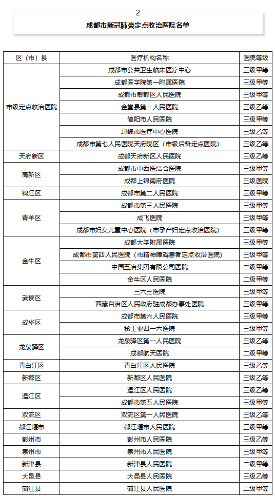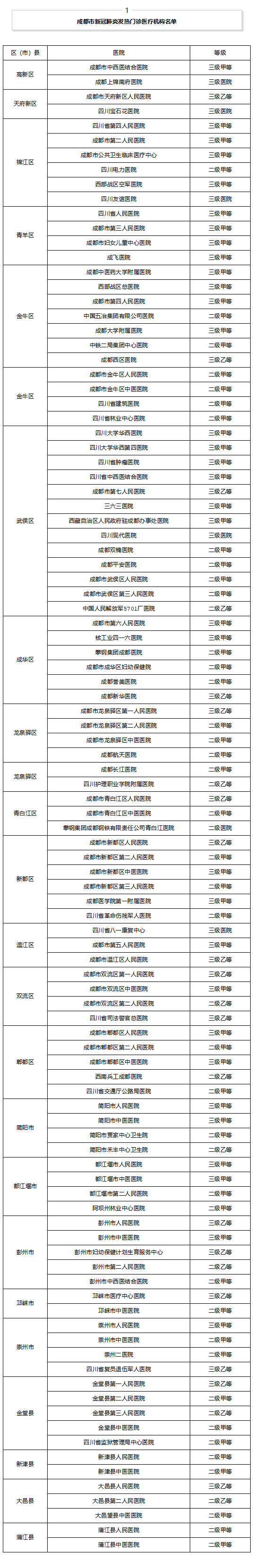 人民網成都2月28日電 今日,成都市衛健委發布通知,為進一步做好全市新冠肺炎疫情防控工作,結合目前疫情形勢,為切實落實“早發現、早報告、早隔離、早治療”要求,充分考慮復工、復產、復學等因素,按照“集中患者、集中資源、集中專家、集中救治”的原則,經研究決定,對成都市新冠肺炎發熱門診和定點收治醫院進行調整,名單如下: