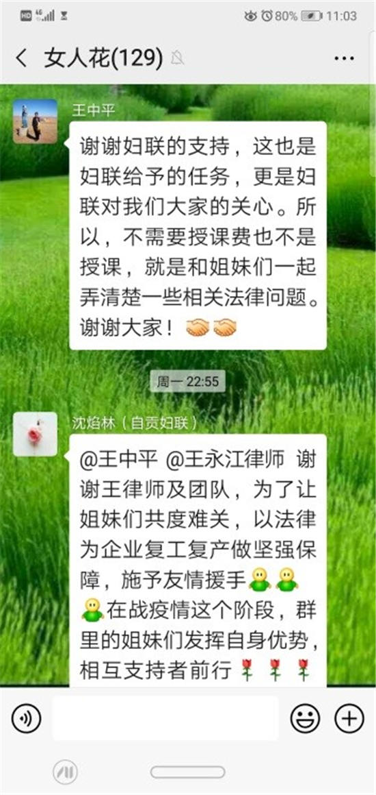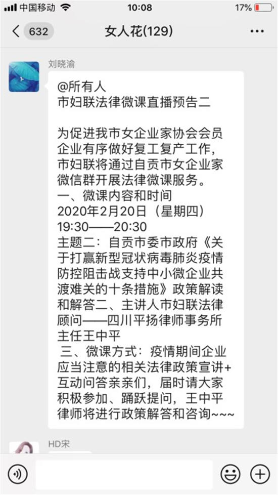 二是舉辦法律微課,服務“零距離”。為更好的服務企業復工復產,市婦聯通過在自貢市企業家協會100余個會員企業中開展摸底調查,針對復工復產中企業可能面對的問題,邀請市婦聯法律顧問在女企業家協會微信群中開展了系列專題法律微課服務,采用“文檔推送+律師宣講+互動問答”的方式為廣大女企業家講解疫情期間企業應當注意的法律事項和應當防范的法律風險,有力促進了女企業家協會會員企業有序做好復工復產工作。