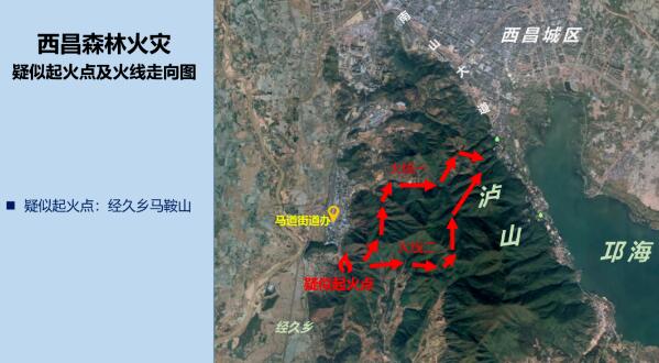 3月以來,西昌進入干風季節,晴熱天氣異常,已連續20日無任何降雨,濕度僅為5%-10%。特別是3月下旬以來已連續4天高溫天氣,30日最高氣溫達到31.2℃,風力7-8級,本次起火點初步判定為大營農場柳樹樁,沿經久、馬道、瀘山后山猛烈擴散,后因風向多變,火情擴散迅速,并伴多處飛火,造成多處多線速燃態勢。