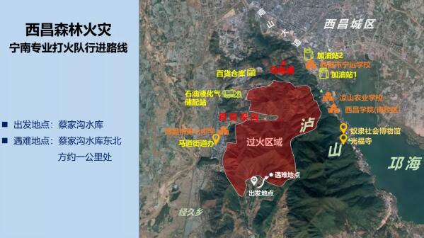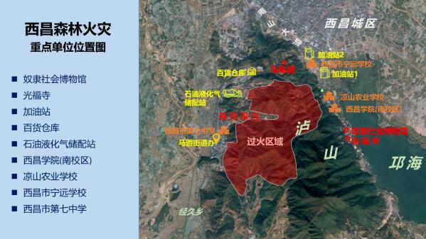 西昌瀘山火災情況危急,不同于一般的森林火災,位于國家級風景名勝區,周邊有眾多重要設施,包括一處存量約250噸的石油液化氣儲配站、兩處加油站、四所學校和奴隸社會博物館、州級文物保護單位光福寺以及西昌最大的百貨倉庫;饎萋,必將會造成無法估量的次生災害,科學撲救刻不容緩;馂陌l生后,周邊三個鄉鎮30分鐘內緊急疏散1200余人,共計疏散18152人。特別是在3個小時內轉移了石油液化氣儲配站高危區域3平方公里內的群眾15000人,酒店、民宿、學校等社會各界均紛紛自發設置群眾臨時安置點。