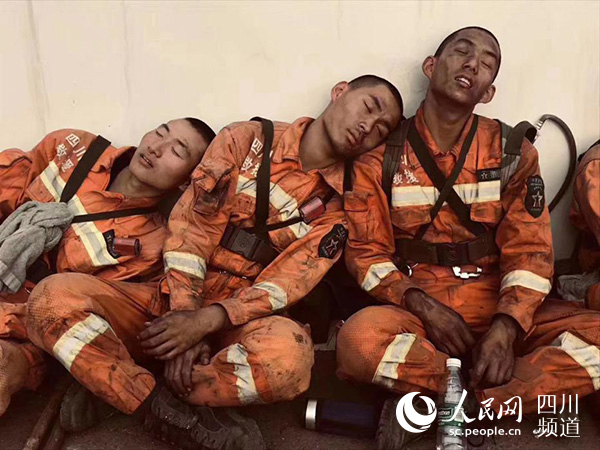 連續作戰的救火隊員下火線休整。西昌市融媒體中心供圖