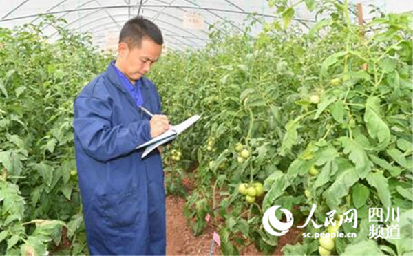 張保才在蔬菜示范園區認真記錄番茄新品種生長情況