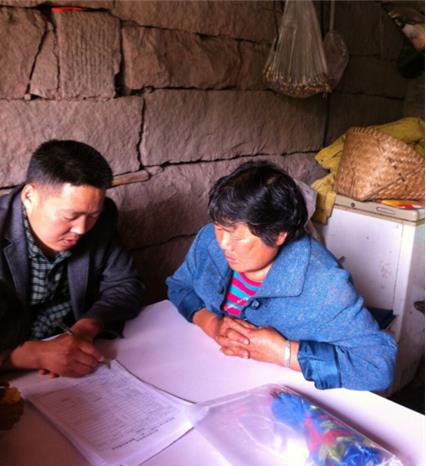 黃澤棟(左)在大田村一組建檔立卡貧困戶趙玉華家入戶調查。照片由大田村提供