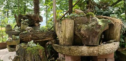 王維利家栽種在木樁上的多肉景觀,穿過木林,能望見影影綽綽的遠山。