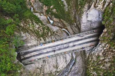 6月29日,俯瞰阿布洛哈村通村公路2、3號隧道之間的鋼橋。新華社記者 江宏景攝