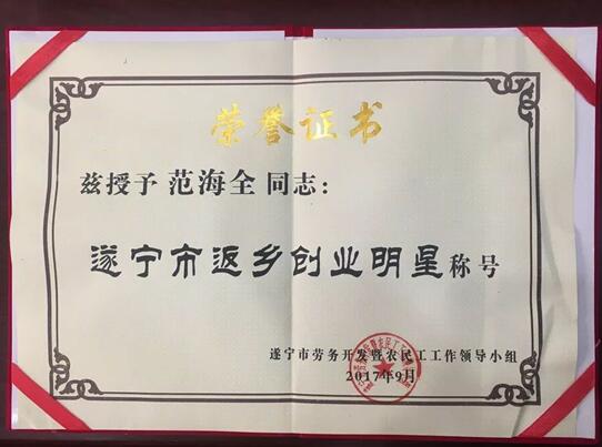 2017年底,又獲得了遂寧市“勞動模范”榮譽稱號。