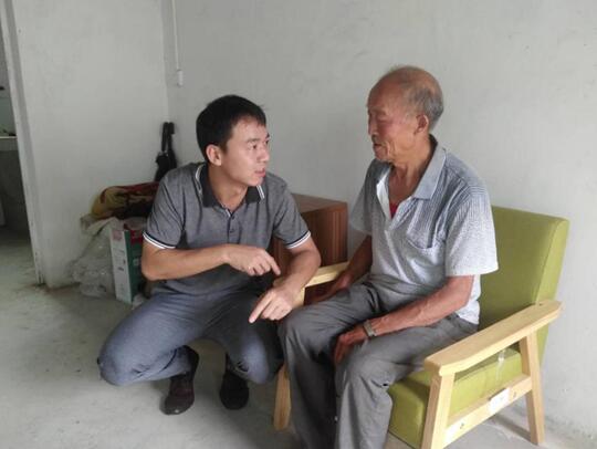 銀河村4社五保戶謝良舉入住新建安全住房后,周敏(左)向其宣講政策,協調解決其廣播電視等問題。周建華供圖