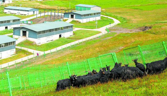 茵茵綠草順著山坡綿延不絕,群山環繞的山谷中有片開闊地帶,綠油油的草坡中“生長”出10多棟天藍色的養殖舍,被稱為“軟黃金”的黑山羊,就在這如畫的風景中快樂地生長——從白玉縣城一路顛簸,經過2個多小時的艱難跋涉,記者和工作隊隊長葉明榮一行終于來到海拔3700米的燈龍鄉康通村,映入眼簾的是猶如夢中的田園牧歌景象。