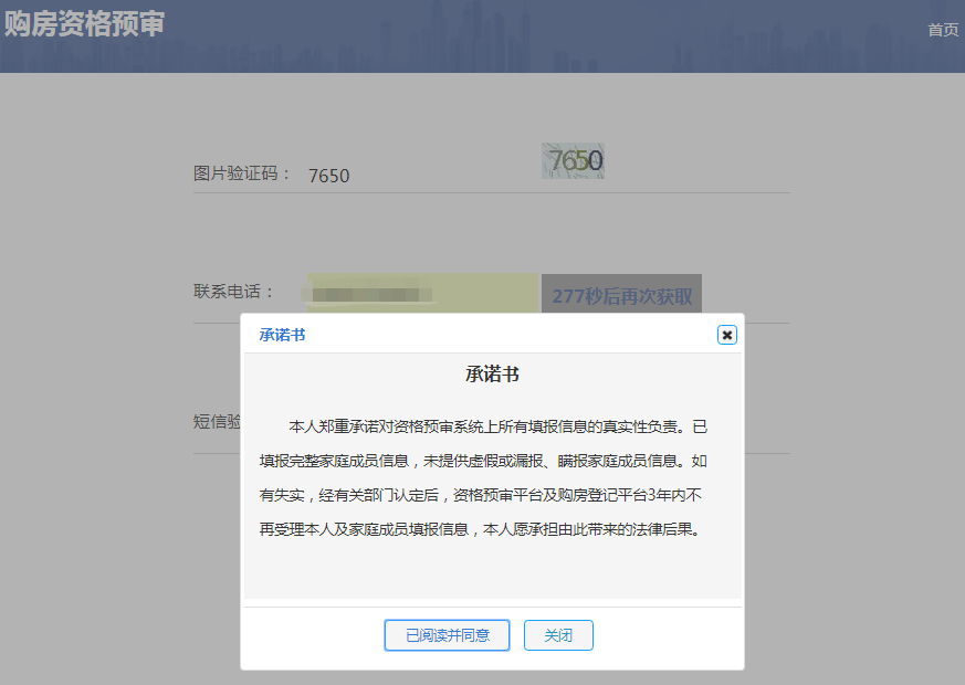7、輸入聯系電話,短信驗證碼,閱讀承諾書,點擊“已閱讀并同意”;