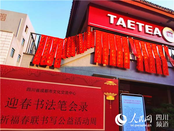 路邊的墻上,掛著一副副迎春對聯,帶著陽光的色澤十分養眼。原來,成都市文化交流中心在這里組織了祈福寫春聯的公益活動。書寫的作品掛在墻上,沐浴著春風,感受著陽光,帶來幾分喜氣。