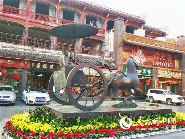 路中間,擺放著秦漢風格的車馬造型,現代的汽車從兩旁川流而過。一步之間,穿越千年。賞不完的蜀風雅韻,買不完的四川特產,數不完的群賢畢至,吃不完的火鍋海鮮……如今的琴臺路,成了成都有名的休閑打卡地、繁華不夜天。