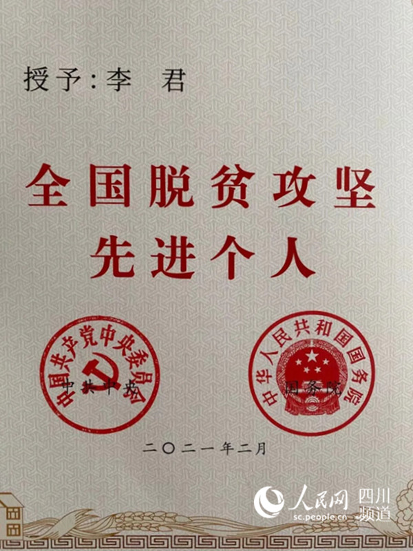 李君被授予全國脫貧攻堅先進個人稱號。受訪者供圖