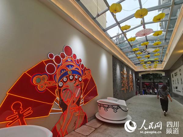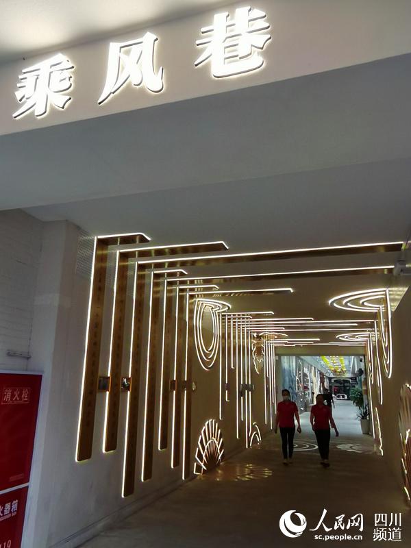 乘風巷是一個文化走廊,穿行其中就瀏覽了華興街的百余年歷史?罩械挠图垈、墻上的老照片,以及地上“蓋”著的鮮紅“川悅華興”大印,都提示游人正在“穿越華興”。巷道里,聲光電技術展現出各種歷史文化元素,如川劇人物、動漫品牌、文創作品等。新技術,老形象,在這里完美結合,愉悅著游人的身心。