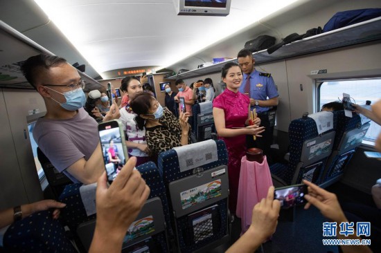 6月28日,在D1758次列車上,演員為乘客表演自貢市特色文化節目四川清音《千年鹽都等你來》。