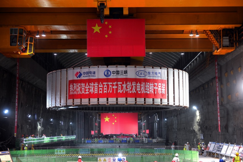 白鶴灘水電站全球首臺百萬千瓦水輪發電機組轉子吊裝。東方電機供圖