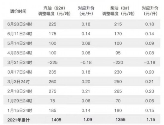2021年國內成品油調價幅度匯總。人民網記者 畢磊制表