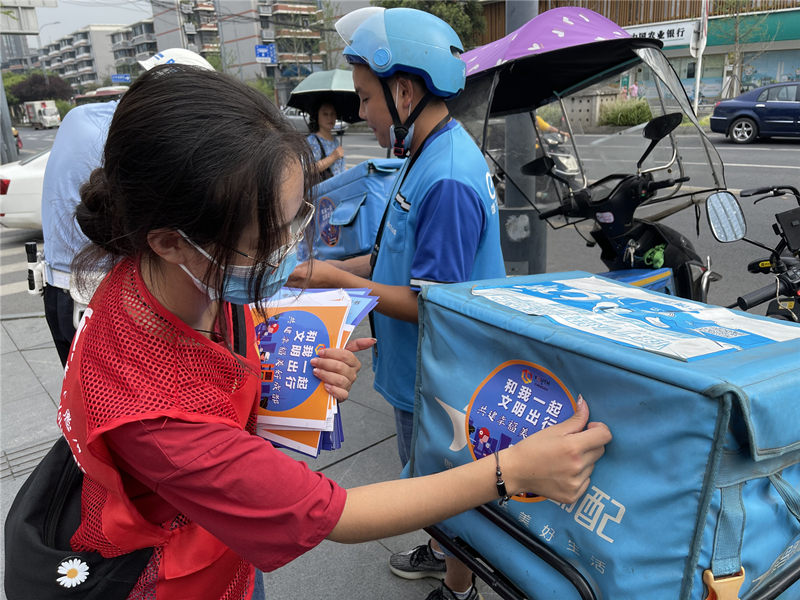 志愿者為快遞小哥張貼安全出行宣傳貼紙。共青團成都市委供圖