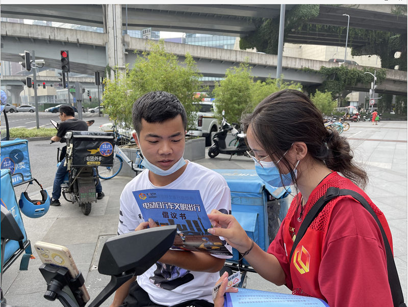 在成都市成華區桃蹊社區,市公安局交通管理局民警還和青年志愿者們一道,向小區居民普及了電動自行車行駛、停放、充電等使用過程中的安全防范問題。面對一些小區居民的疑惑和不解,他們耐心地一一解答,獲得了現場居民的好評。除了走進企業和小區,在成都街頭,身穿紅色小馬甲的青年志愿者們也忙得不亦樂乎。在天府廣場、人民南路、春熙路等9個點位,青年志愿者們積極協助現場執勤民警維持電動自行車出行秩序,提醒騎乘人員遵守道路交通規則,做好自身防護,并向騎乘人員發放了電動自行車文明出行倡議書,引導群眾有序、文明出行。