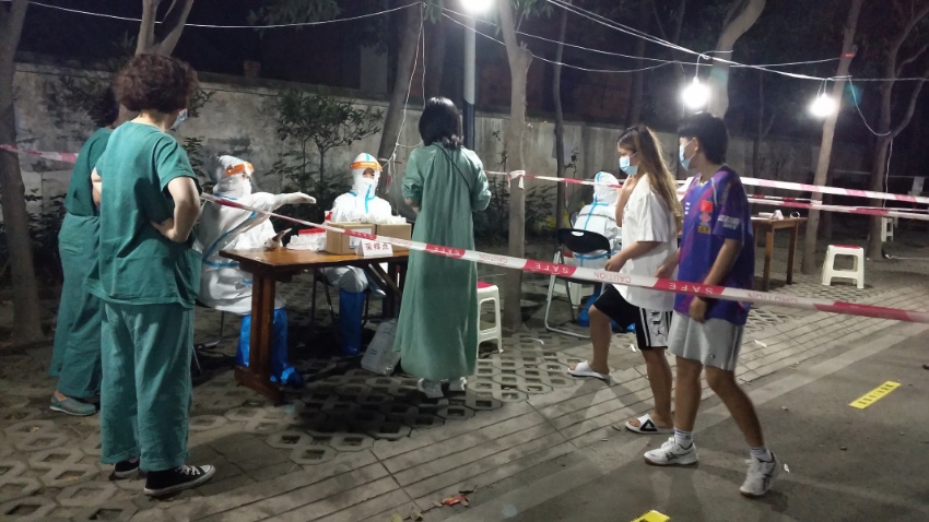 室外,是近40度的高溫。穿著密不透風的防護服,全副武裝的工作人員緊張有序地工作,等候的居民自覺排起整齊的長隊。