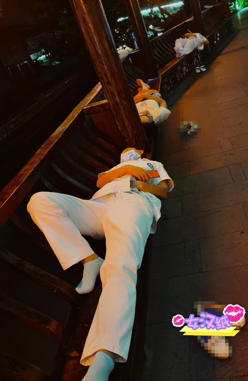 一直到凌晨12點,采樣工作還在進行。這個時間點,工作量稍有減少,部分工作人員趕緊抓緊時間休息,儲存體力,之后還要去換下夜里值守的同事。他們說:“如果你看到這樣一群女孩子,在廣場座椅上、角落里不顧形象地席地而躺,請諒解。她們實在是太困了!”