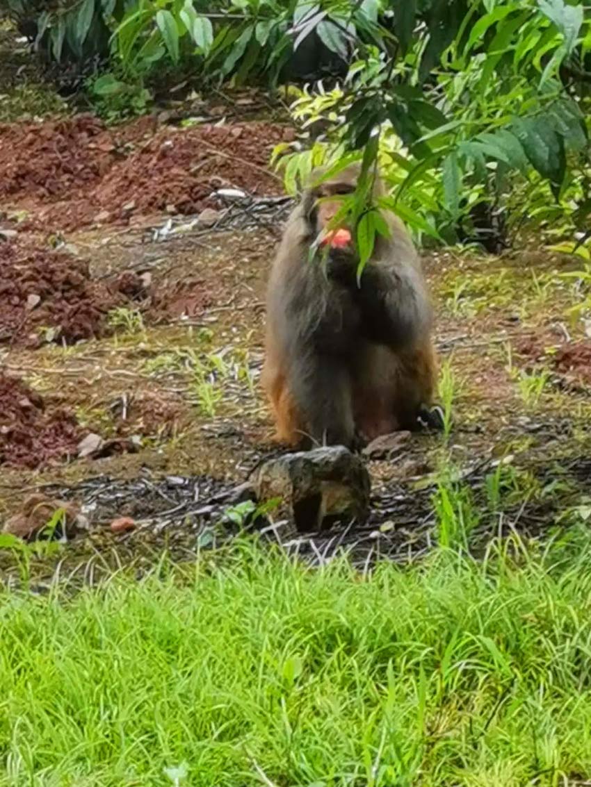 “一只猴子正坐在地里,抱著桃子在啃,另外兩只在上面坎坎上(方言:田坎)坐著的,看樣子已經吃過了!币姷竭@樣的場景,劉貞祥趕緊掏出手機拍照,幾只猴子反應靈敏,立即起身逃掉了。