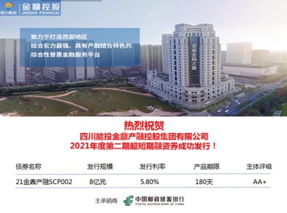 近日,四川能投金鼎集團在銀行間交易商協會成功發行2021年度第二期超短期融資券“21金鼎產融SCP002”,發行規模8億元,債券期限180天,主體評級AA+,發行利率5.8%。