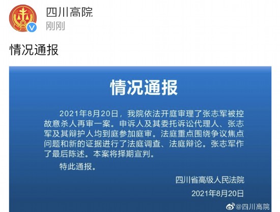 2021年8月20日,四川省高院針對社會關注的“四川彭州岳父殺害女婿一家三口案”發布情況通報。