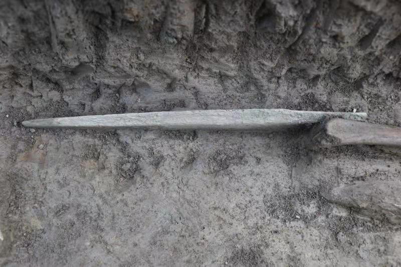 此次搶救性發掘發現了豐富的遺跡現象并出土了大量遺物,共清理出西周和春秋時期的墓葬80余座、房址10余座、灰坑60余個、灰溝3條、窯1座、灶1座等,出土了大量的青銅器、玉石器、陶器等遺物,青銅器主要有劍、鐁、帶鉤、印章、敦等,其中柳葉形劍、印章等都是典型的蜀文化器物。